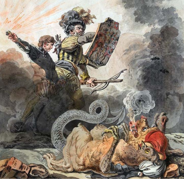 Helvetia, importata dalla Francia e incarnata da un drago a tre teste viene sconfitto e esala l'ultimo respiro. Davanti un gallo con un cappello da giullare e una campanella, al centro un cane ansimante con un berretto rosso da giacobino, dietro un asino. Tell, accompagnato dal figlio Walter, tiene rivoluzione elvetica, uno scudo con i tre mitici fondatori della Confederazione, Walter Fürst, Werner Stauffacher e Arnold von Melchtal.