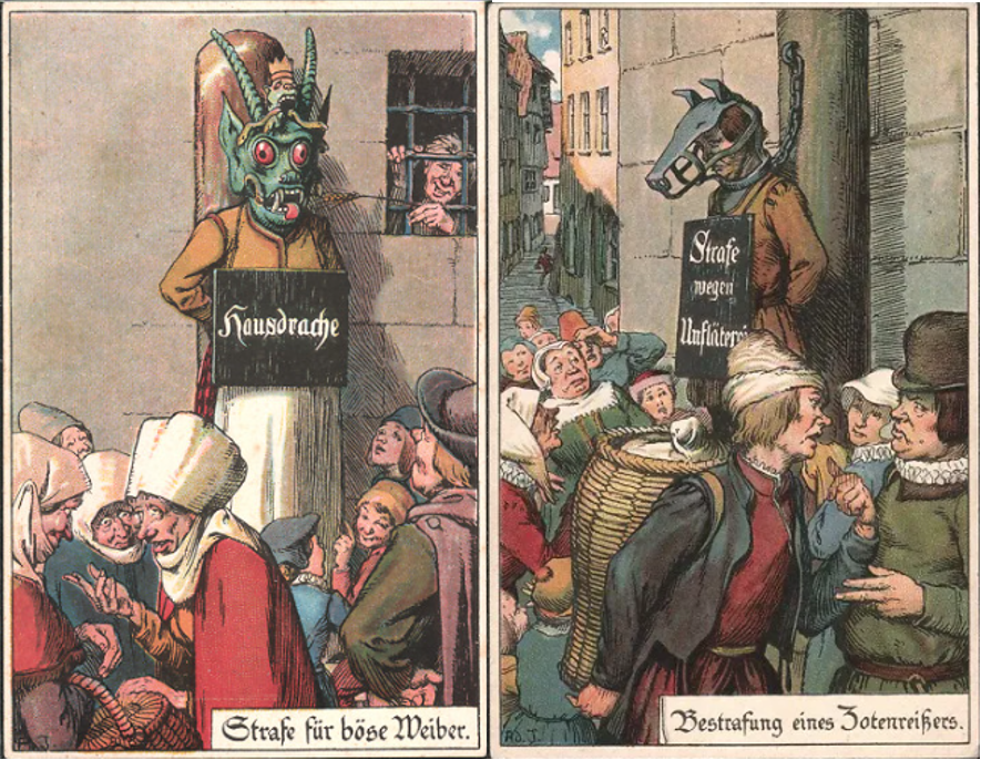 Una mi era fino ad oggi sfuggita, lo Schandmantel, o mantello della vergogna; erano dei barili di legno talvolta rivestiti di lamiera Era una pena finalizzata a umiliare il condannato che doveva indossarlo in pubblico per subirne l'umiliazione e inoltre poteva essere insultato e colpito con verdura marcia che gli veniva lanciata contro.