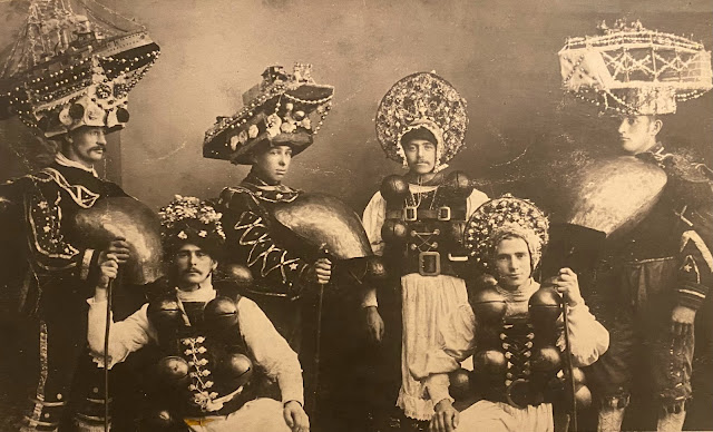 Le prime bellissime Chlausenhauben di Capodanno intorno al 1900 erano solite decorare i loro cofani e cappelli con ornamenti dell'albero di Natale e oggetti simili.