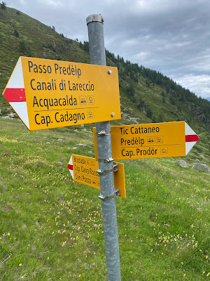 Il cartello sul Passo Sole indica in un ora per raggiungere il Passo Predelp. Questa é l'unica notizia positiva. Il passo Predelp si presenta come quello tecnicamente più difficile, quello più di alta montagna. ANche il dislivello seppur non mortale (da 2179 da lago di Cane a 2449 del passo per un totale di 270 metri).