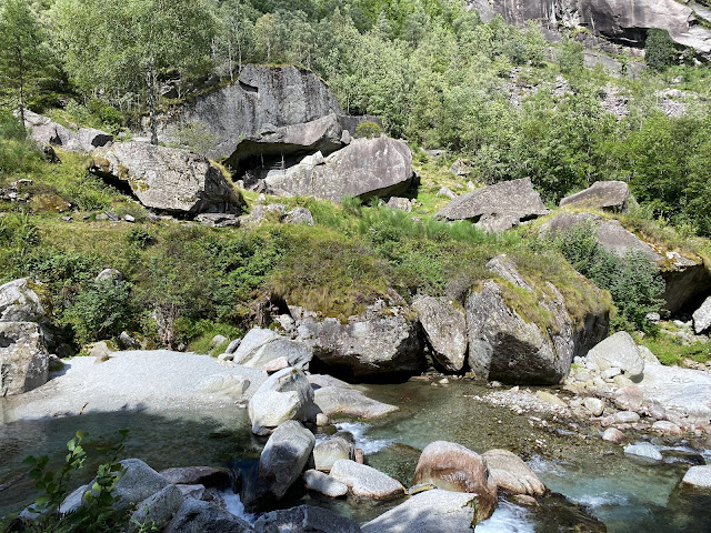 La voglia di scoprire il resto della valle é più forte che mai, mi incammino sul versante sinistro del fiume in un sentiero quasi sempre all'ombra, moltissimi i sassi più o meno grandi sparsi un po' ovunque, scenario che caratterizza tutta la Val Bavona.