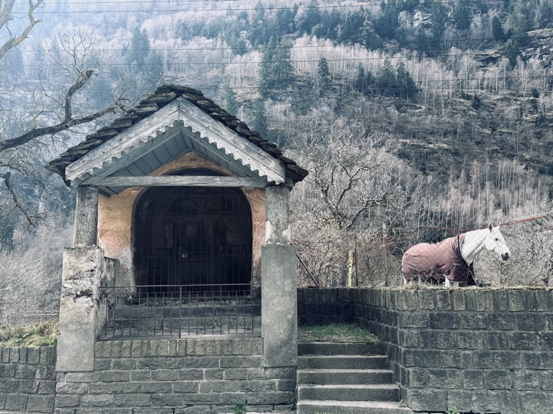 La cappella dà direttamente sulla cantonale, un cavallo assonnato a dir poco completa il quadretto. All’interno di nuovo un atmosfera trasandata e decisamente darkeggiante