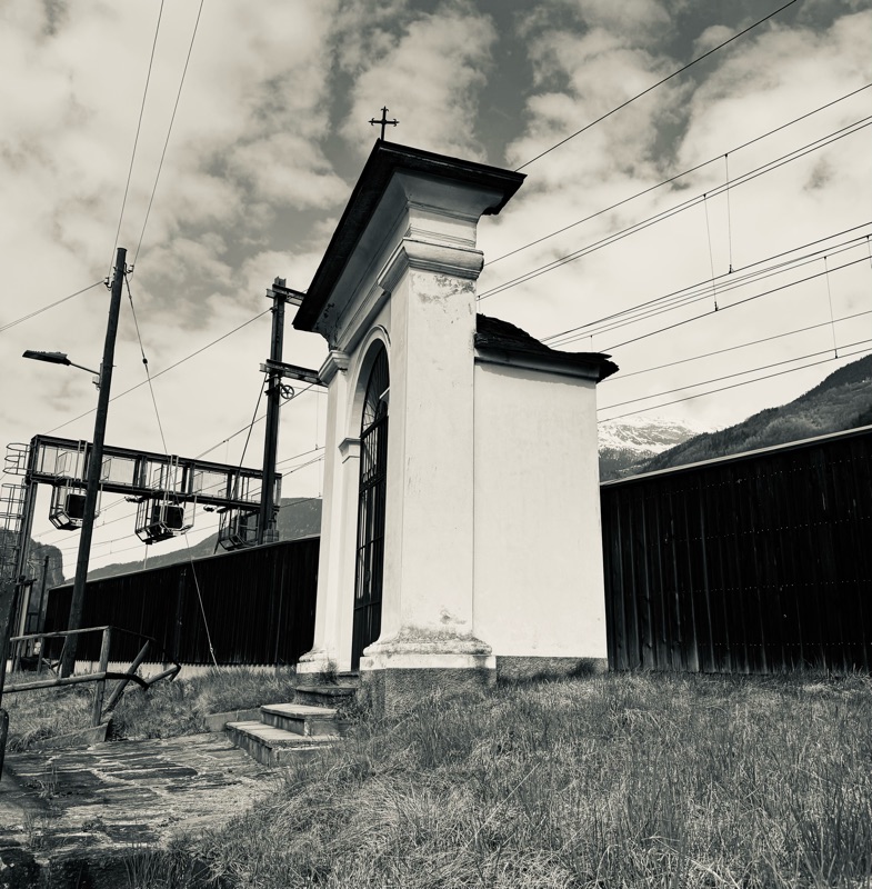 Mi dirigo verso la seconda cappella obiettivo della giornata, sulla strada impossibile non notare la cappella attaccata alla ferrovia, un contrasto forte, degno da essere riportato nell' ERGO SUM