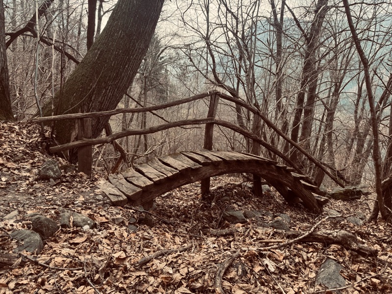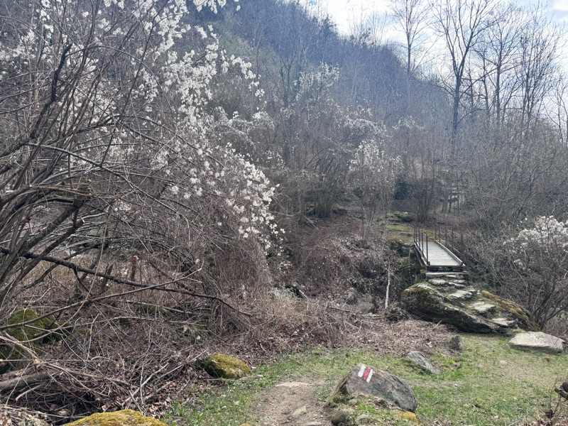 Proseguo la discesa incrociando altre cappelle con affreschi di buona fattura anche se la meraviglia se la conquista un piccolo ponte ad arco in legno nel bel mezzo del bosco.