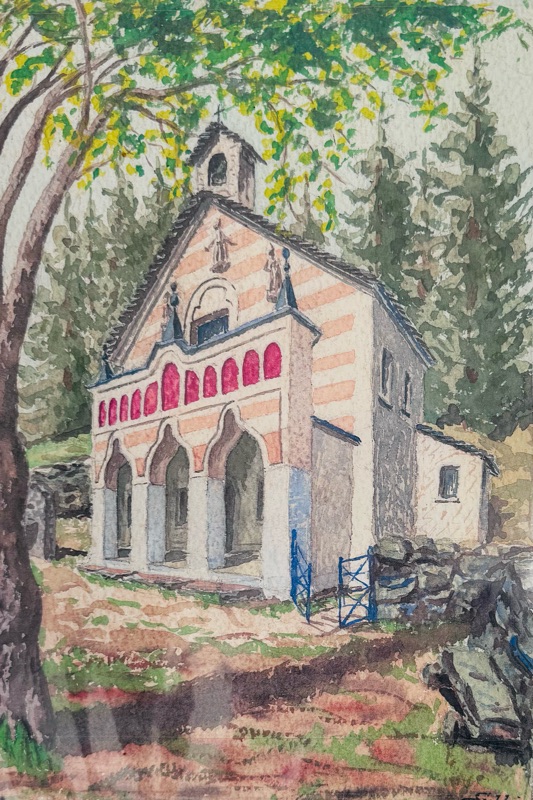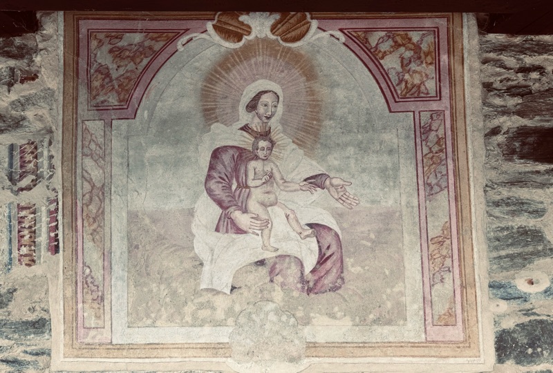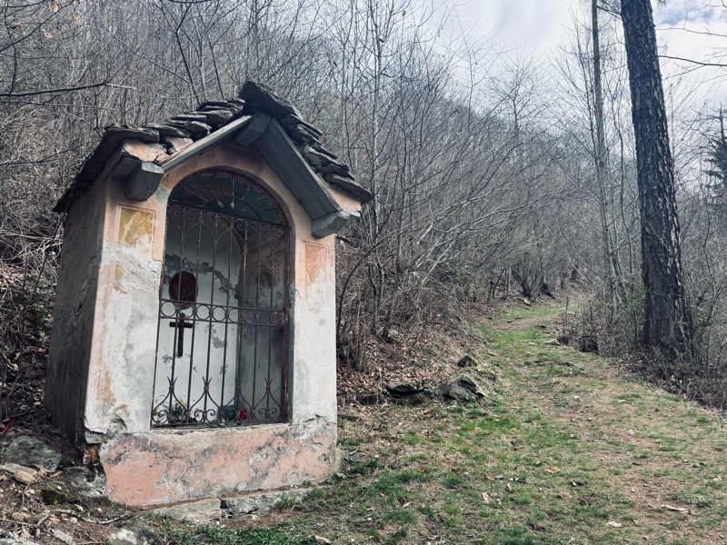 Sfilo davanti al lavatoio e mi immetto nel sentierino che ridiscende verso il fondovalle. Una prima cappella é subito all’imbocco del sentiero, appena sopra il cimitero, contiene affreschi in stato di degrado che conferiscono però un aria lugubre e affascinante allo stesso tempo