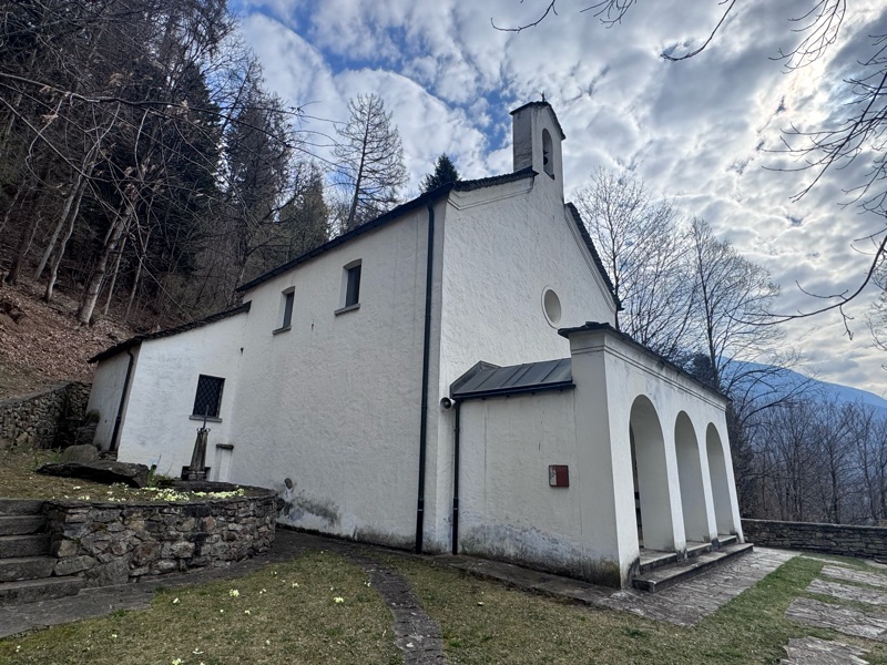 Dopo questa ennesima gioia per gli occhi scorgo la “cappella finale” (papabile titolone da film campione d'incasso)Percorrendo la strada cantonale dopo l'uscita dell'autostrada, la cappella si trova sul lato sinistro. Si tratta di una grande cappella con portico a capriata in legno, interamente intonacata, riazata dalla strada con un muretto, e tre scalini d'accesso tra il portico e la nicchia; nicchia voltata a botte, chiusa da un cancello in ferro con rete, con mensa d'altare in legno e due predelline lignee decorate. Orientata a nord-ovest. Data di costruzione: 1888; committente: ignoto DECORAZIONE Artista: ignoto; data di esecuzione: 1888