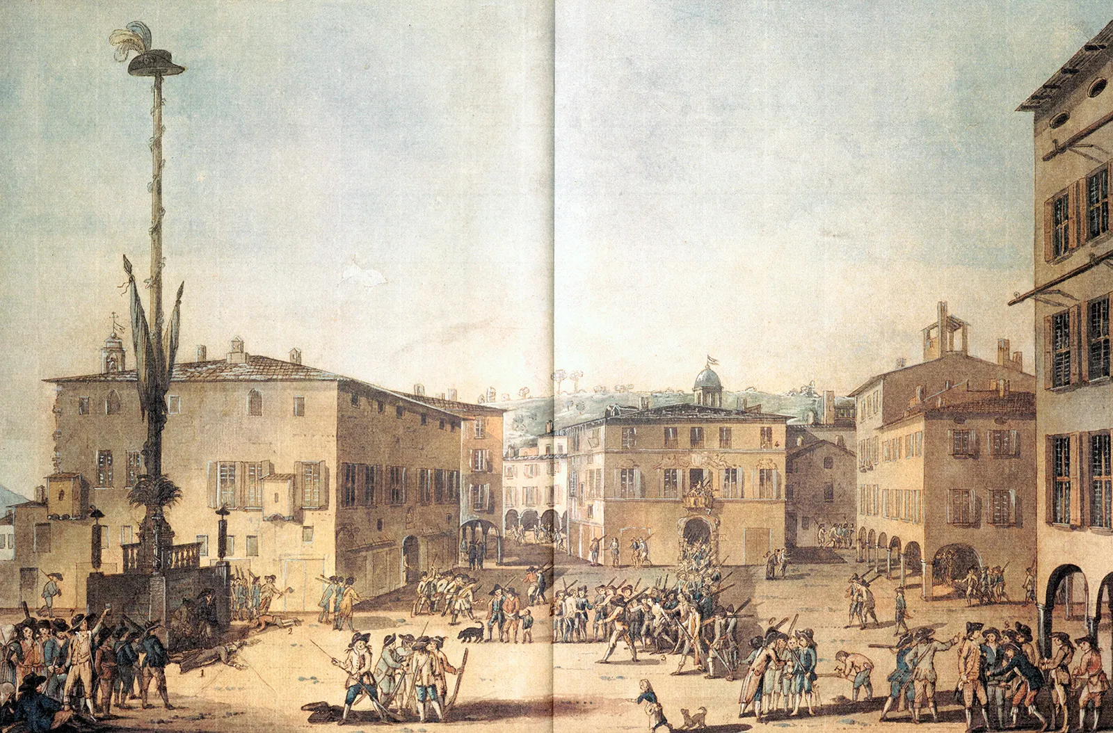 L’albero della libertà con il cappello di Tell in Piazza Grande a Lugano, 1799. Penna e inchiostro di Rocco Torricelli. Collezione Città di Lugano