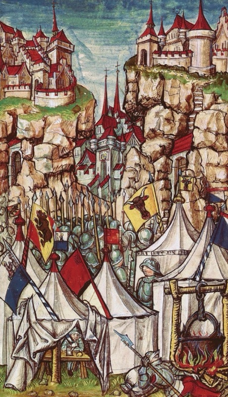 L'assedio a Bellinzona da parte dei Confederati agli inizi del dicembre del 1478, poco prima della battaglia di Giornico; illustrazione della Luzerner Chronik (1513) di Diebold Schilling (Zentral- und Hochschulbibliothek Luzern, Sondersammlung, Eigentum Korporation Luzern).