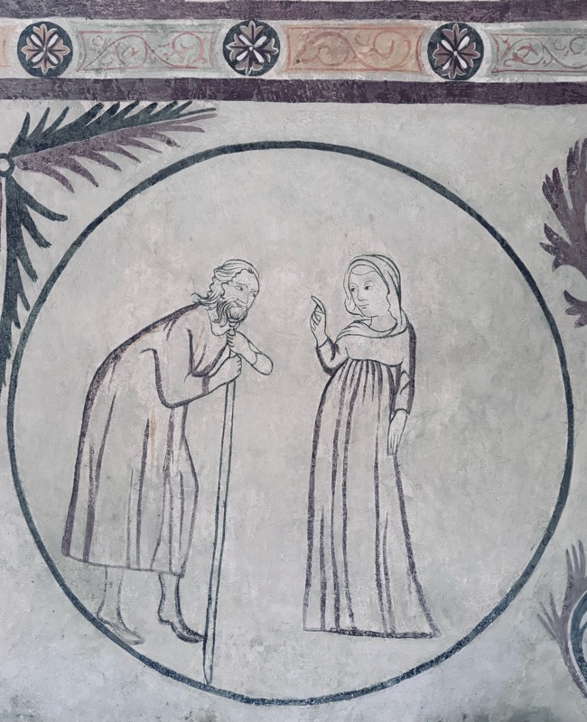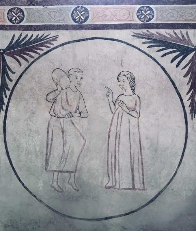 Accanto a questa fascia inferiore, che in origine illustrava il ciclo delle età della vita, si intravede sull’altro lato anche un ciclo dei mesi. Si tratta di raffigurazioni tipicamente medievali, in cui venivano rappresentate le attività agricole e rurali svolte nei diversi periodi dell’anno. In questo caso si riconoscono momenti legati alla semina e alla mietitura. Siamo probabilmente tra la fine dell’autunno e l’inizio dell’inverno. È plausibile che lungo tutta la fascia inferiore della parete, e forse anche sulla controfacciata, fossero presenti le altre scene del ciclo mensile, come avviene frequentemente in contesti sacri analoghi.