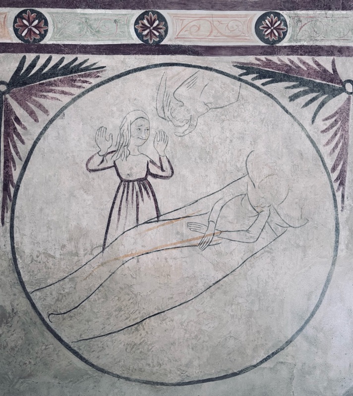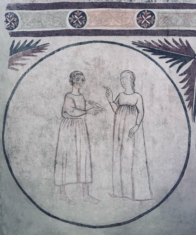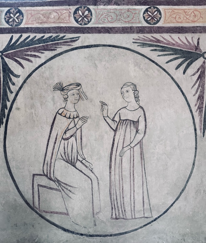 Queste sono raffigurazioni che solitamente si trovano in manoscritti miniati, soprattutto sul supporto pergameneo o successivamente cartaceo. Quindi sono delle raffigurazioni legate soprattutto al testo scritto, che accompagnavano dei contenuti di carattere morale o filosofico. Il caso eccezionale di Chironico è che le vediamo invece in forma di affresco, anche se a livello stilistico sono molto semplici, perché sono monocromatici, ci sono pochissimi tratti di colore, però è un unicum abbastanza importante perché effettivamente non capita spesso di vedere questo tipo di raffigurazione all'interno di un ambiente sacro in questa forma.