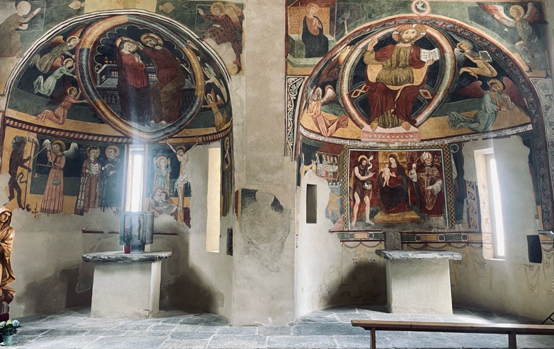 Questo rappresenta un aspetto piuttosto particolare per le chiese medievali absidate, anche nell’area di Valdidentro. Nella maggior parte dei casi, infatti, si trova una struttura a navata unica con una sola abside, alla quale viene aggiunta una seconda abside in una fase costruttiva successiva. In questo caso, invece, l’edificio fu concepito fin dall’inizio con due absidi.