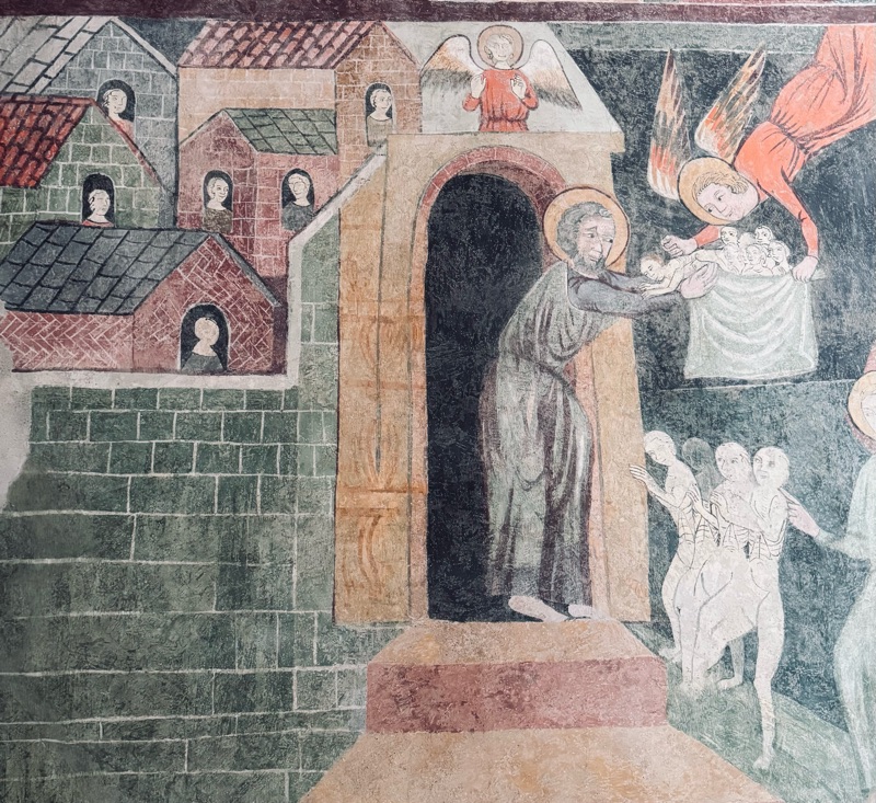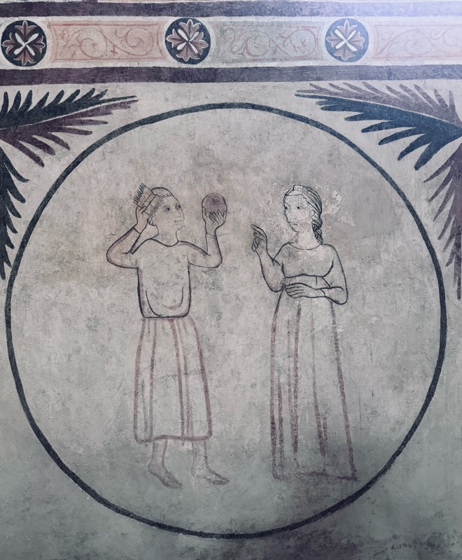In parallelo a questi medaglioni, che condividono la stessa impostazione stilistica, si nota una struttura coerente degli ambienti. Le pareti sono organizzate in modo simile: una fascia inferiore monocromatica, separata da una striscia decorativa, e sopra due registri principali con le storie dei santi legate al contesto rappresentato.Accanto a questa fascia inferiore, che in origine illustrava il ciclo delle età della vita, si intravede sull’altro lato anche un ciclo dei mesi. Si tratta di raffigurazioni tipicamente medievali, in cui venivano rappresentate le attività agricole e rurali svolte nei diversi periodi dell’anno. In questo caso si riconoscono momenti legati alla semina e alla mietitura. Siamo probabilmente tra la fine dell’autunno e l’inizio dell’inverno. È plausibile che lungo tutta la fascia inferiore della parete, e forse anche sulla controfacciata, fossero presenti le altre scene del ciclo mensile, come avviene frequentemente in contesti sacri analoghi.