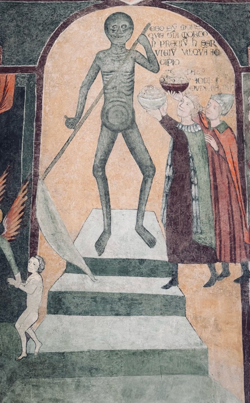 La principale novità è la rappresentazione della Morte come figura personificata: appare al centro, in cima a una scalinata, con la falce e accompagnata da un’iscrizione in cui afferma di non accettare doni da nessuno. Ai suoi piedi sono raffigurati due personaggi simbolici: da un lato un re o sovrano, emblema del potere civile, dall’altro una figura che rappresenta il potere ecclesiastico.